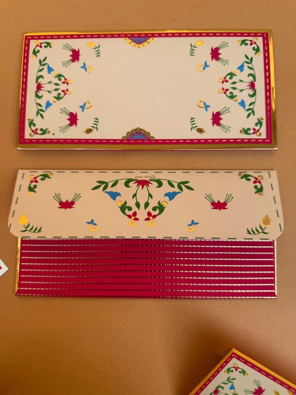 Gold foiled border with intricate Paisley design. Back of an envelope is a show stopper with foiled lines all over.
